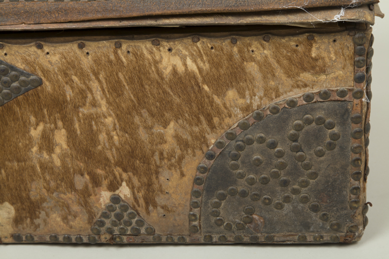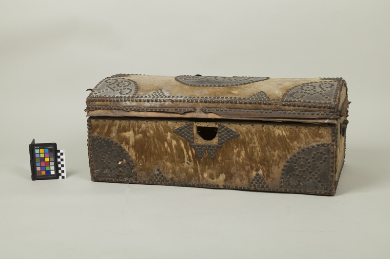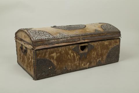 Mueble para guardar ropa de forma rectangular, base plana y tapa convexa. Es de madera, está forrado con cuero y posee decorado de metal.