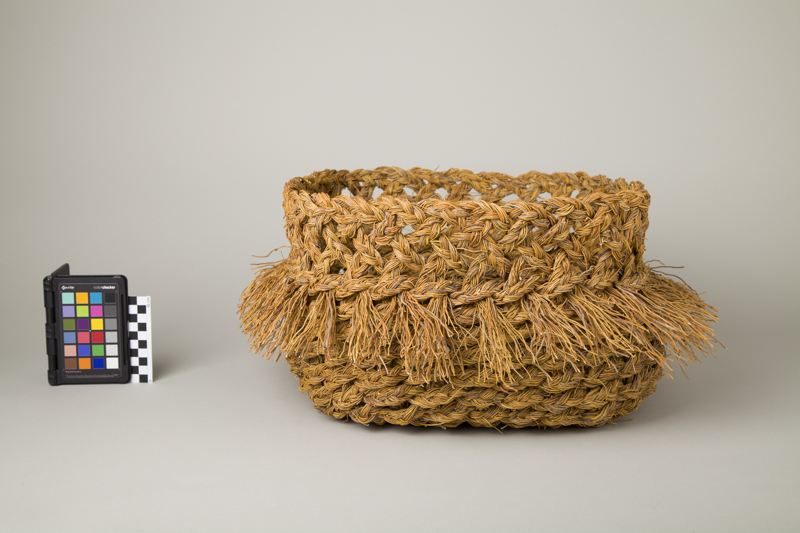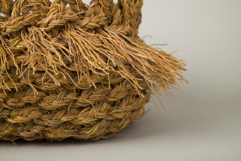 Contenedor de uso doméstico de forma cuadrangular y base plana, elaborado a partir del tejido de una trenza de fibra vegetal de tres hebras. Color marrón anaranjado.