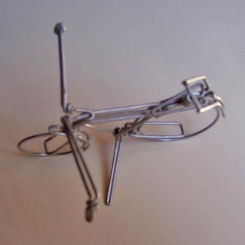 Figura exenta, tridimensional que representa una bicicleta. Se encuentra elaborado en metal torsionado de color gris claro. Superficie brillante.