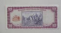 Reverso: número 10 en cada esquina; borde superior Banco Central de Chile; lado izquierdo pintura del Abrazo de Maipú; lado derecho E° 10 y escudo nacional.