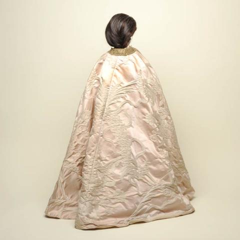 Figura femenina que está de pie con brazos extendidos hacia adelante, cabeza levemente inclinada hacia la derecha. Viste túnica color rosada con bordados dorados y capa color beige y pasamanería dorada en el ruedo. Solo presenta rostro y manos tallados, el resto es un armazón. Sobre la cabeza lleva una peluca de pelo natural que está trenzada.