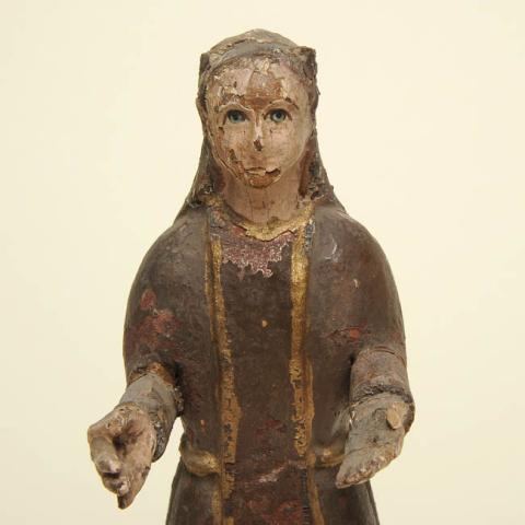Figura masculina de madera tallada que está de pie sobre una base cuadrangular, con los brazos flectados hacia adelante en ángulo recto. Viste un traje de color café y presenta en la cabeza un pañuelo del mismo color del traje.