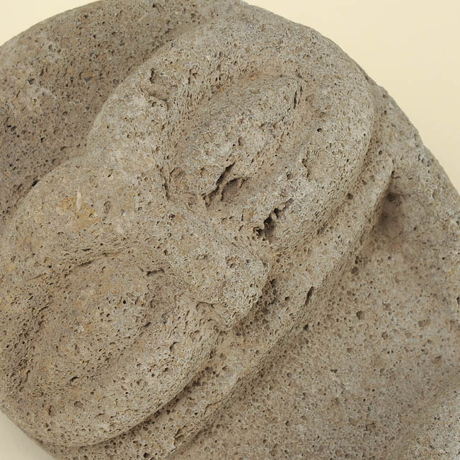 Objeto de forma ovalada regular con base plana. En la parte frontal se encuentra tallada como un rostro humano estilizado con la boca abierta y ojos destacados con reborde. Piedra tallada y pulida de color gris claro.