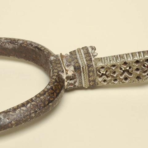 Objeto metálico, usado para ajustar la espuela al talón del calzado y sujetar la rodaja a la espuela. Está compuesto por dos partes, un arco que tiene los extremos rectangulares con perforaciones. En el centro del arco tiene un elemento alargado decorado con líneas incisas, llamado pihuelo.