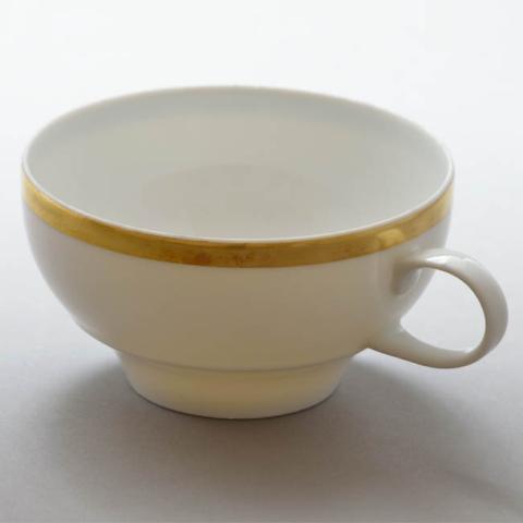 Vajilla destinada al servicio del te. La taza es un contenedor de boca circular, amplia y borde recto. Cuerpo es de volumen cóncavo y a un costado tiene un asa curva y plana; al extremo inferior se eleva sobre un zócalo de menor diámetro. La base es circular y plana.