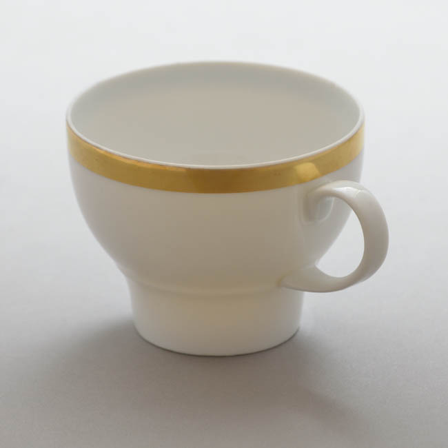 Vajilla destinada al servicio de café, esmaltada blanca. La taza es un contenedor de color blanco, boca circular, amplia y borde recto. Cuerpo es de volumen cóncavo, en un extremo lleva un asa curva y plana. El extremo inferior es restrigido y de menor diámetro. La base es circular y plana.