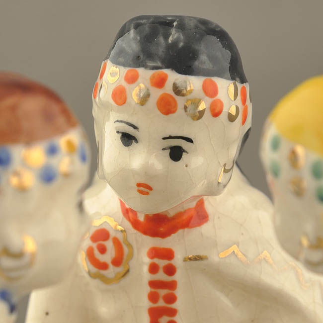 Objeto utilitario. Contenedor rodeado por tres figuras femeninas tomadas de las manos alrededor de la boca del vaso. Las mujeres presentan vestimenta mapuche, que cubre hasta los píes. Está esmaltada de color blanco, detalles localizados de vestido en azul y marrón, con aplicación de dorado.