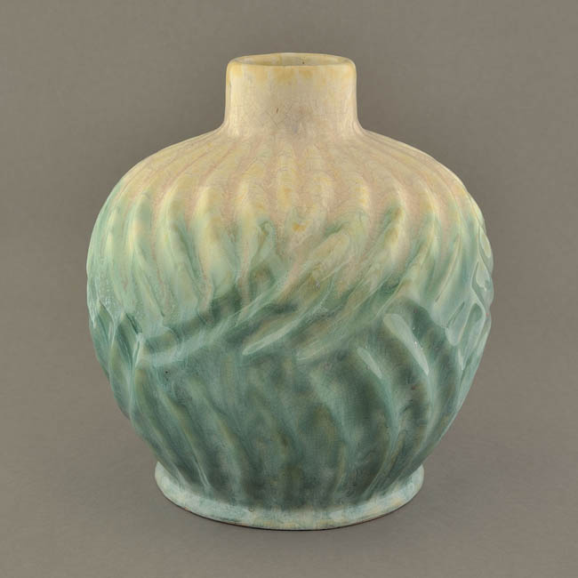 Objeto decorativo de uso doméstico. Contenedor de volumen globular. Al extremo superior presenta boca circular, breve y cuello cilíndrico, tiene aspecto más abultado en la parte alta. La zona inferior es de menor perímetro, las paredes convergen en la base circular y plana. La superficie está esmaltada en forma irregular de color blanco amarillo y turquesa más intenso en la base. La superficie presenta un relieve geométrico.