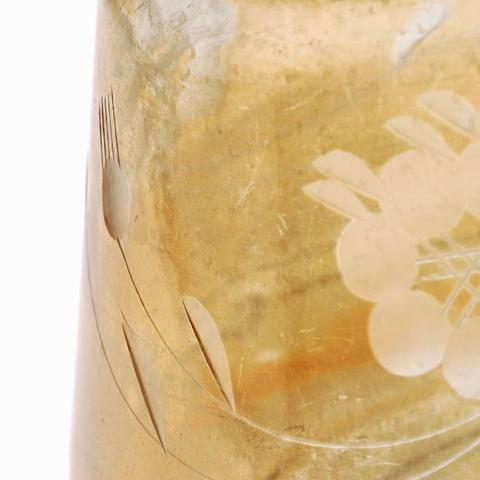La botella presenta decoración esmaltada y el vaso luce una franja menuda tallada junto a la boca.