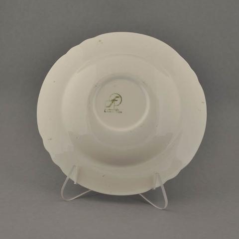 Pieza circular, presenta un borde breve y elevado, y una amplia depresión central, en forma cóncava. Los extremos del borde presenta una terminación en festón curvo. Está esmaltado blanco y presenta decoración en diseño vegetal, a un extremo junto al borde, tiene una gran flor rosada y hojas.