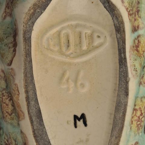Los objetos producidos por la Fábrica de Cerámica de Lota presentan diferentes tipos de marcas de fábrica que han sido clasificados en 9 grupos por FAIP-N-67-EST 2014. Estudio de caracterización: Cerámica de Lota en el Museo de Artes Decorativas. Este objeto corresponde al Grupo C constituido por la inscripción LOTA en letra imprenta dentro de una forma elipsoidal.