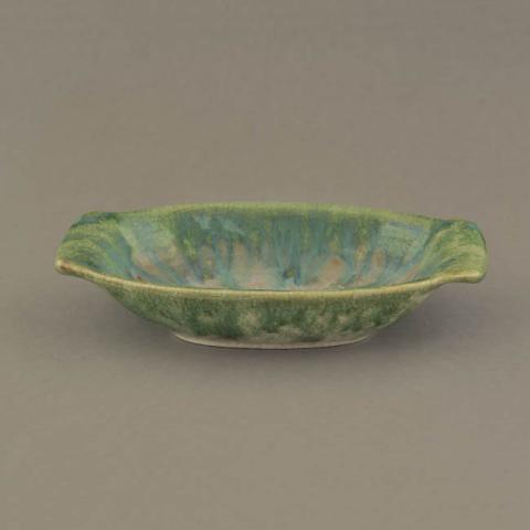 Objeto utilitario. Contenedor rectangular de paredes altas y los extremos laterales presentan el borde prolongado. Al extremo inferior, se eleva sobre un zócalo rectangular. Está esmaltado de colores verde, turquesa y marrón en forma irregular.