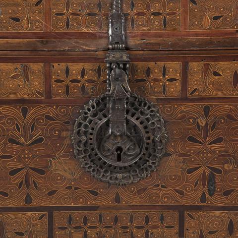 Mueble de guardar y transportar, con tapa encorada en forma de tejadillo o medio cañón. Construida en madera de color claro, tiene taracea realizada con maderas de colores y motivos vegetales al interior y exterior. Tiene herrajes, tiradores laterales y gran bocallave frontal de forma circular en metal calado. La decoración es de elementos vegetales estilizados, predominando patrones y volutas.