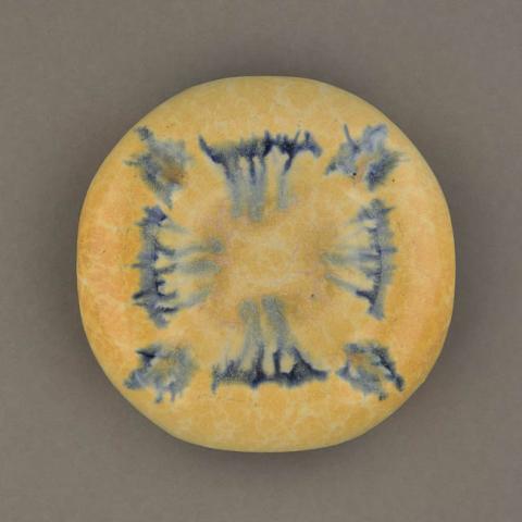 Objeto utilitario.Recipiente de formato circular, tiene una importante cavidad central y las paredes están formadas por una moldura ancha y en cada ángulo tiene un surco bajo relieve. Las paredes exteriores presentan cuatro depresiones curvas en la zona inferior lateral. Está esmaltado irregular de color amarillo y manchas azules en la zona alta de la superficie.