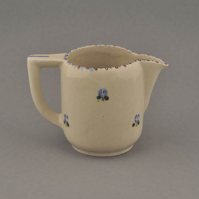 Objeto utilitario. Contenedor circular con una boca amplia y con un pico para verter el líquido, contrapuesto a este se encuentra un asa vertical, presenta una base más estrecha que la boca. La superficie es de color beige con decoraciones de flores azules y adornos circulares de color marrón y azul en el borde superior.