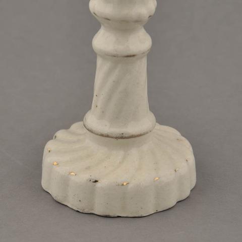 Objeto utilizado para poner velas, al extremo superior presenta el porta vela con una abertura circular, el borde amplio en ondas y la base es cóncava, forma una estrangulación que en la zona media, le une a un fuste cilíndrico, delgado y alto. En el extremo inferior, se abre formando un pie de perfil cónico, circular y de reverso plano. Está esmaltado completamente transparente con decoraciones dorado en los ribetes. Presenta decoración en relieve, con anillos y estrías retorcidas.