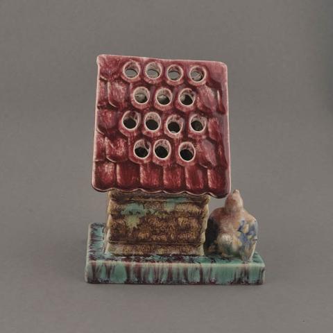 Objeto decorativo de uso doméstico, utilizado para poner flores. Es un contenedor en forma de pequeña casa, con techumbre a dos aguas de color rosada y orificios circulares; las paredes son de color marrón claro. Al frente, junto a la puerta un pequeño pajarito. El extremo inferior, se eleva sobre una base rectangular, de reverso plano esmaltado de color verde y manchas marrón. Está completamente esmaltado de manera irregular de colores violeta, marrón, verde, azul, rosado y amarillo.