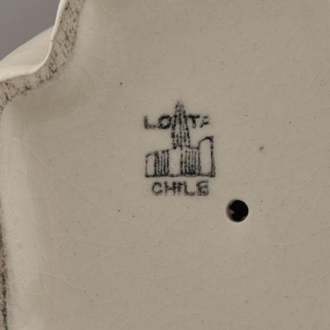 Los objetos producidos por la Fábrica de Cerámica de Lota presentan diferentes tipos de marcas de fábrica que han sido clasificados en 9 grupos por FAIP-N-67-EST 2014. Estudio de caracterización: Cerámica de Lota en el Museo de Artes Decorativas. Este objeto corresponde al Grupo E constituido por la inscripción LOTA y perfil de fábrica.