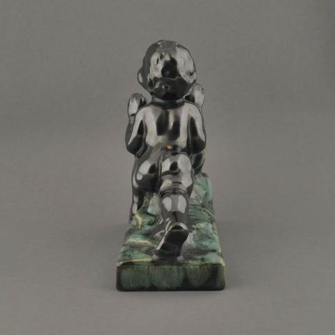 Objeto utilitario. Representación de dos pequeños infantes desnudos. Uno de cubito dorsal, cabeza erguida, con el torso apoyado en sus antebrazos. Tiene las extremidades unidas junto al cuerpo. Se eleva sobre un volumen de ángulo recto y base plana. El otro infante está sentado y apoyado en espalda, tiene la cabeza inclinada sobre el pecho y las manos sobre su abdomen; también se eleva sobre un volumen de ángulo recto. Las figuras están pibtadas con esmalte negro metalizado, en la base tonalidades verde y amarillas aplicadas en forma irregular.