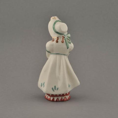 Pieza decorativa, representa una niña de pie; al extremo superior destaca su cabeza, con una capelina y cabellos rizados que caen y enmarcan el rostro. Los brazos están junto al cuerpo en frente, en sus manos sostiene un pequeño bolso. Está esmaltado transparente y detalles en forma controlada de negro en ojos, verdes y rojos en la vestimenta.