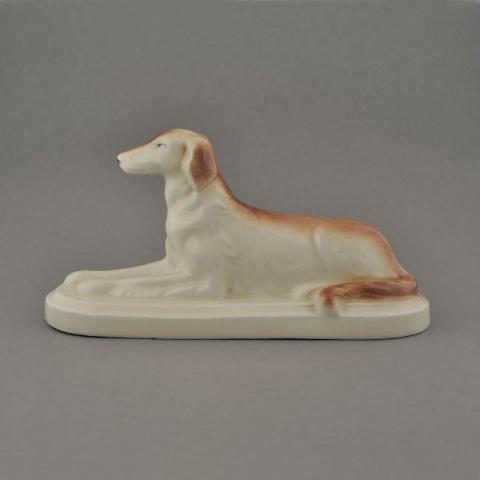 Objeto decorativo, representa la figura de un animal, perro, echado; presenta la cabeza erguida, estilizada, el cuerpo alargado descansa sobre sus patas. La figura se eleva sobre una base de forma ovalada. Está esmaltado blanco con aplicación de marrón en el lomo, y negro en ojos y boca de la figura.