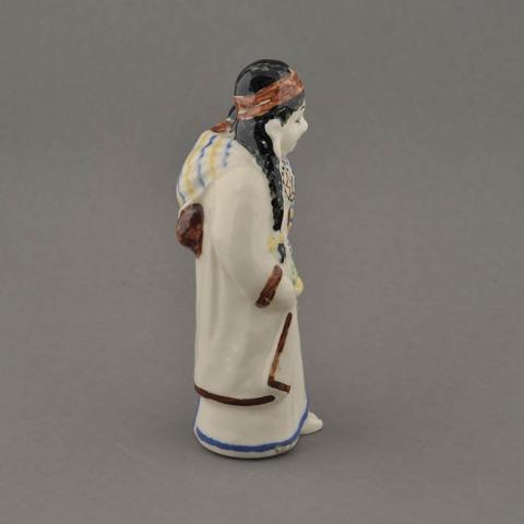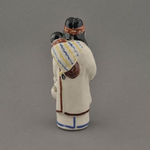 Objeto decorativo, figurilla representa una mujer de pie, cargando un pequeño infante en su espalda. Presenta vestimenta y accesorios mapuches. Está esmaltada transparente con decoración en esmaltes de colores, negro, azul, amarillo y marrón, aplicados de foma localizada para detalles.