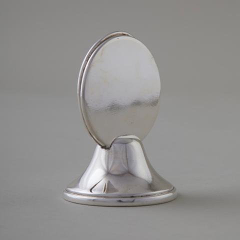 Objeto de uso decorativo, utilizado para señalar un puesto de mesa. En el extremo superior presenta lámina circular plana, con una delgada moldura en el borde y en su centro un número arábigo que señala el veinte. Se eleva sombre un pie campaniforme.