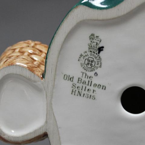 The Old Balloon Seller. Inglaterra, 1956. Diseñada por A. Leslie Harradine en 1929 para Royal Doulton. Porcelana moldeada y policromada bajo cubierta, pieza H.N. 1315, de la serie Vendedores Ambulantes