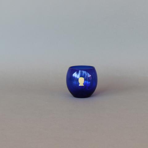 Vaso cilíndrico de paredes abultadas, de aspecto transparente, color azul; el extremo superior es de dimensiones reducidas, con una amplia boca circular de borde recto. El cuerpo tiene un perfil convexo y las paredes convergen formando una base aguda, circular y plana; ésta tiene aspecto macizo y un color más intenso.