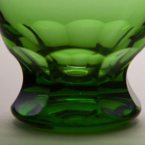 Contenedor cilíndrico de aspecto transparente color verde oscuro. Al extremo superior tiene una boca circular amplia, de borde recortado en forma recta; las paredes son breves, levemente abultadas en la zona inferior, formando una concavidad. Se eleva sobre un importante zócalo de aspecto macizo y de color más intenso; éste presenta decoración tallada en diseño geométrico, con una franja de óvalos. La base es breve circular y plana.