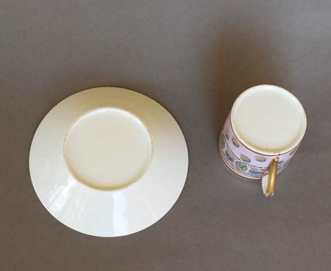 El platillo es circular al anverso tiene borde elevado y presenta una depresión central con un rebaje circular. Está esmaltada de color rosado pompadour y dorado con detalles decorativos.