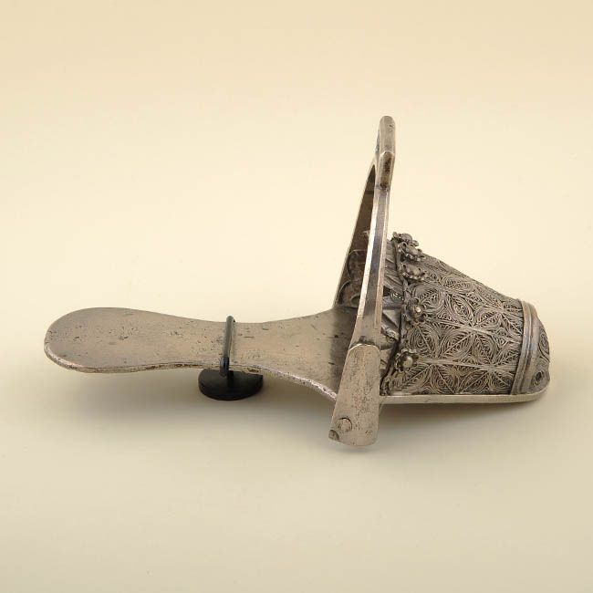 Estribo tipo sandalia. Objeto de uso femenino metálico con forma de estribo, utilizado para apoyar el pie al cabalgar. Compuesto por una base lisa y un cono truncado decorado con motivos vegetales y florales, dividido en tres zonas: un borde decorativo compuesto por nueve semicírculos con triángulo central y siete flores sobrepuestas, de ocho pétalos cada una; la decoración del cono se estructura en ocho franjas realizadas en filigrana de plata con diseños vegetales combinados simétricamente formando flores de cuatro pétalos que rematan en una puntera aguda, terminada en un arco de plata fundida cuyo interior lleva el mismo diseño de flor de cuatro pétalos. En la zona media lleva un arco articulado de bordes biselados y sin ornamentos, coronado al centro por una cavidad de forma trapezoidal prominente, cuya función es engarzar el estribo a la silla de montar. El extremo inferior está compuesto por una plantilla lisa, sin decoraciones y de formas curvas, en el sector inferior o suela tiene grabadas iniciales.