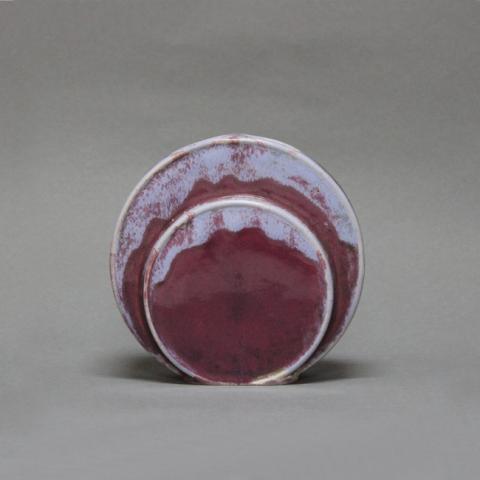 Contenedor decorativo de uso doméstico, utilizado para poner flores. De forma similar a una rueda, formada por la sobreposición de dos formas circulares, una de menores dimensiones que la otra; al extremo superior presenta dos orificios rectangulares. Al extremo inferior, la base se eleva sobre un breve zócalo rectangular y plano. Esmaltado en forma irregular de color celeste en la zona y magenta oscuro en la base.