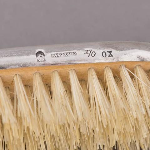 Objeto de uso personal, utilizado para limpieza. Instrumento compuesto por cerdas breves y tupidas ensambladas en un armazón de madera de forma elíptica y recubierta por una lámina de metal que se prolonga en un mango alargado, rectangular, más ancho en la base y esquinas redondeadas. Presenta decoración en base a diseño figurativo de rosas entre ramas con espinas y hojas, en el borde posee moldura abultada.