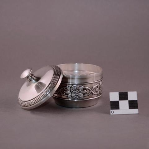 Objeto metálico de uso personal. Contenedor de formato cilíndrico, en cuyo extremo superior presenta una tapa circular con tomador central prominente en forma de cono invertido. El contenedor tiene una abertura circular, paredes de perfil recto que disminuyen su diámetro en el cuarto inferior de la pieza y que convergen en una base circular plana.