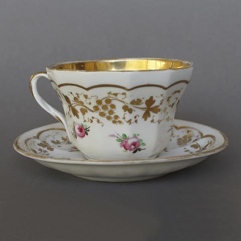 Conjunto formado por una taza y un platillo. La taza es un volumen cónico, el extremo superior es amplio y tiene abertura circular, la pared es de perfil recto y converge en el extremo inferior, forma una concavidad en la base de menores dimensiones. A un extremo lateral tiene un asa curva prominente .