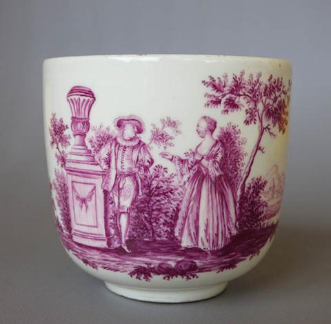 Ambas piezas están esmaltadas de color blanco y presenta decoración figurativa en color morado, esta representa una escena galante, ubicada en al parte frontal de la taza.