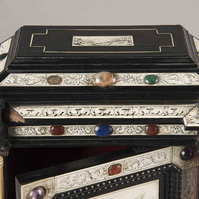 Mueble pequeño de formato vertical para guardar joyas, de uso femenino. De madera ebonizada, con bandeja interior, forrado en terciopelo rojo. En el exterior la madera esta tallada con ondas suaves a modo Flammenleisten, cintas de hueso esgrafiadas e incrustaciones de piedras. El dibujo central en la puerta presenta una escena en que dos cupidos están alrededor de una rueda afilando sus flechas. Flanqueando la puerta tiene dos columnas de marfil torneadas de fuste liso, zonas media y extremos, solo una se conserva. La decoración de las cintas de hueso son vegetales (acantos) y en sentido vertical decorado con grutescos. La parte superior tiene una placa incrustada de hueso esgrafiada con un paisaje con casas. Los laterales tienen incrustación en filete de hueso formando estructuras geométricas. El interior de la puerta tiene una placa esgrafiada con flor enmarcado en un filete de hueso incrustado. Descansa sobre cuatro patas de forma cuadrada para poner sobre una mesa u otro mueble de apoyo. Se observa un timbre en la parte posterior que aparentemente dice FERD BOGLIANI MILANO. En el centro del timbre también posee una escritura, pero está ilegible.