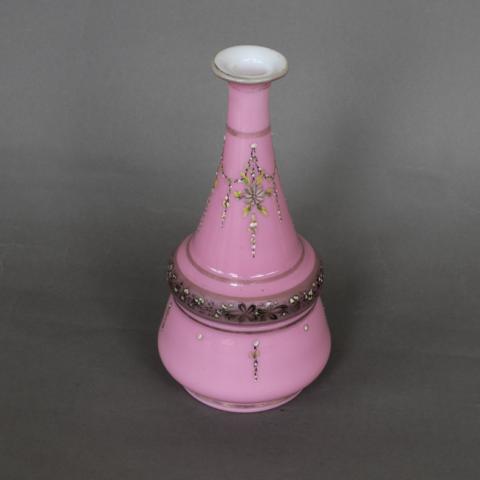 Contenedor decorativo de uso doméstico, de volumen restringido y compuesto. Al extremo superior presenta una breve boca circular, con el labio formando una arandela. El cuello es cilíndrico, alto; en la zona media presenta un anillo abultado y se abre en un cuerpo troncocónico con mayor perímetro en la base, ésta es circular, amplia y plana; se eleva sobre un breve zócalo circular. De color rosado, presenta decoración en diseño figurativo, formada por lazos y flores menudas ubicadas en el cuello; una franja en la zona media y bajo ésta. El interior es de color blanco.
