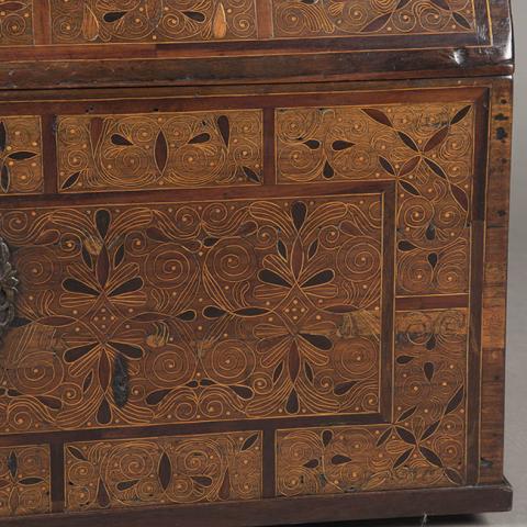 Mueble de guardar con tapa encorada en forma de tejadillo o medio cañón. De madera color café claro y taraceada con otras maderas de diversos colores y motivos vegetales. Tiene herrajes, tiradores laterales y bocallave frontal circular de metal calado. La decoración es de elementos vegetales estilizados en que predominan patrones y volutas.