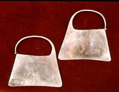 Par de objetos para colgar de las orejas, consistente cada uno en una lámina trapezoidal, de base ancha, un borde superior se prolonga en arco tubular que toca el ángulo del borde contrapuesto.