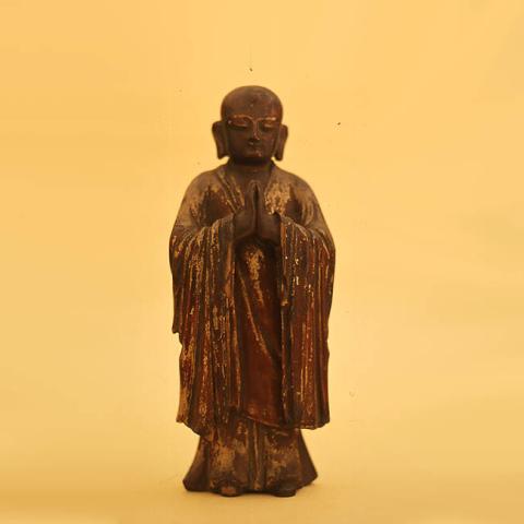 Objeto de culto budista tallado en madera y dorado. Representa a un anciano de pie, brazos junto al cuerpo y las manos juntas al centro en posición de oración. Su cabeza es calva y tiene orejas alargadas. Viste túnica amplia que le cubre todo el cuerpo, con mangas largas. La figura pertenece a un altar doméstico (butsudán) que se encuentra en la colección, arma una triada con otra figura similar de aspecto más joven y un Buda. Una de las figuras representa a un anciano la otra a un hombre joven.