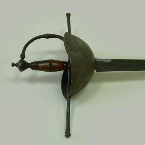 Arma blanca, de mano corto-punzante, compuesta de empuñadura y hoja. Empuñadura constituida por pomo metálico terminado en botón de espiga; mango de madera rematado en una cruz, desde donde se desprenden dos gavilanes y guardamanos en dirección hacia el pomo; posee una cazoleta semicircular. Hoja recta, de doble filo, terminada en una punta afilada; en ambos lomos posee una inscripción.