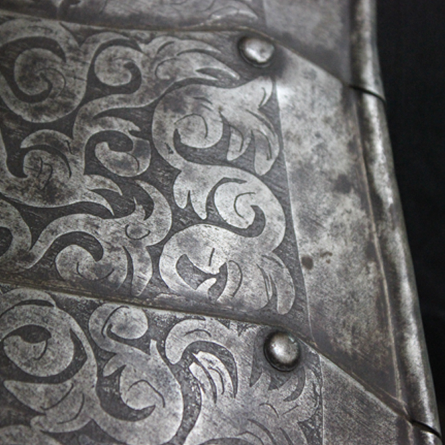 Presenta decoración grabada, en torno a un escudo central, en el peto, con animal fabuloso coronado lanzando llamaradas desde las fauces; al extremo superior lleva un ave rapaz con alas extendidas y al inferior un guerrero enfrentándose a un dragón. El diseño repite un patrón vegetal entrelazado y un animal fabuloso, tipo de dragón.
