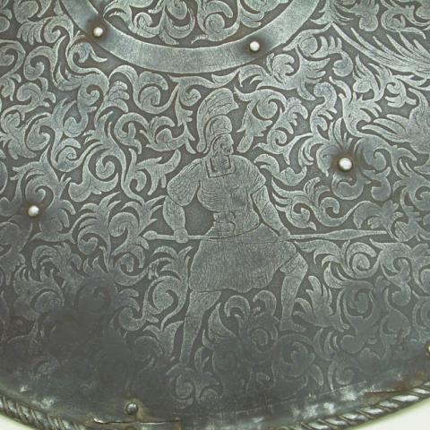 Arma defensiva. Arma circular con cordón de metal en el borde y con punta en su parte central; lleva decoración con motivos antropomorfos (de guerrero) y zoomorfos (aves y vegetales).