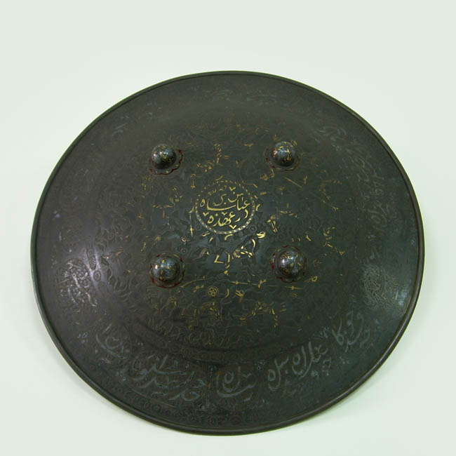 Arma defensiva. Arma circular el anverso presenta un volumen abovedado al centro y cuatro esferas prominentes en su parte media; decoración en base a grabados de diseño figurativo, con guerreros, animales, vegetales de color dorado y entrelazos de caracteres árabes.