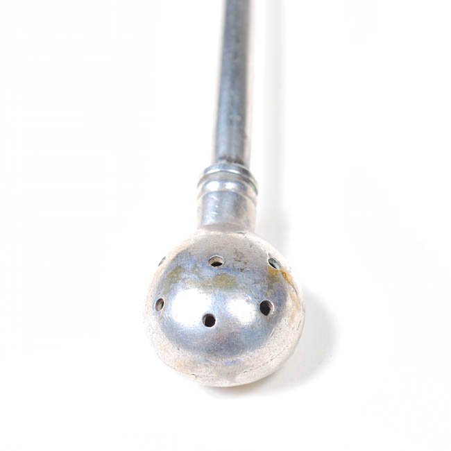 Pieza utilizada para sorber y filtrar infusión de mate, es cilíndrica, delgada; extremo superior forma poligonal marca la boquilla; inferior esfera con orificios. Decoración en caña, 5 anillos bajo relieve y una forma de espiral en relieve marcada con línea incisa.