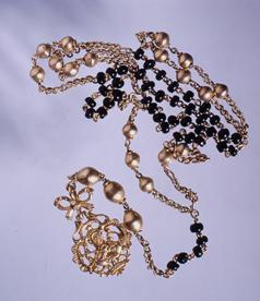 Objeto de devoción cristiana, utilizado para oración mariana. Esta formado por una sarta de cuentas de piedra negra y otras de mayor diámetro doradas, unidas en los extremos a una medalla dorada, calada con un busto femenino al centro.