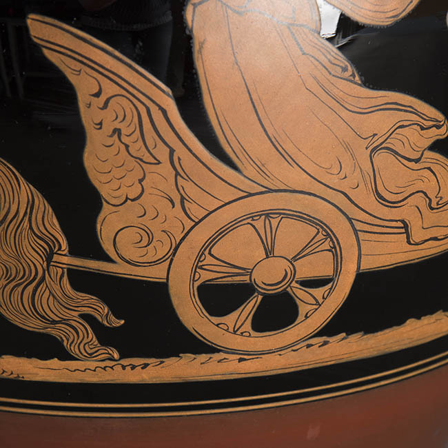 Contenedor de volumen globular, color negro y marrón, Al extremo superior presenta una importante abertura circular, cuello breve y restringido, hombros altos y sobre estos tiene dos asas circulares de diámetro breve. El extremo inferior es restringido y tiene una base circular y plana. Presenta decoración inspirada en motivo griego clásico, con una figura femenina de pie sobre un carro tirado por 2 caballos, ubicada al centro del cuerpo.