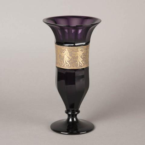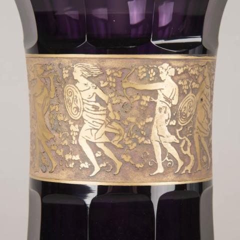 De color púrpura, con la superficie del cuerpo trabajada en diez facetas. Presenta una aplicación de franja de bronce conocida como oroplastic, estilo Fipop con escenas de Amazonas.